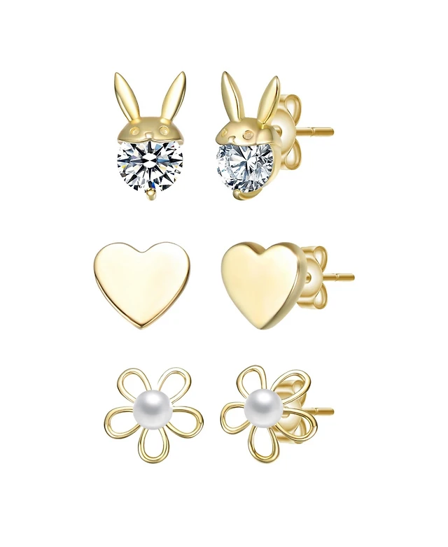 Genevive Sterling Silver 14K Gold Plated with Clear Cubic Zirconia Trio Hearts Hoop Earrings