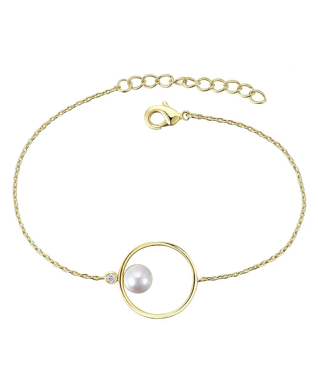 14k Gold Plated with White Genuine Freshwater Pearl Solitaire Asymmetrical Wire Halo Delicate Bracelet