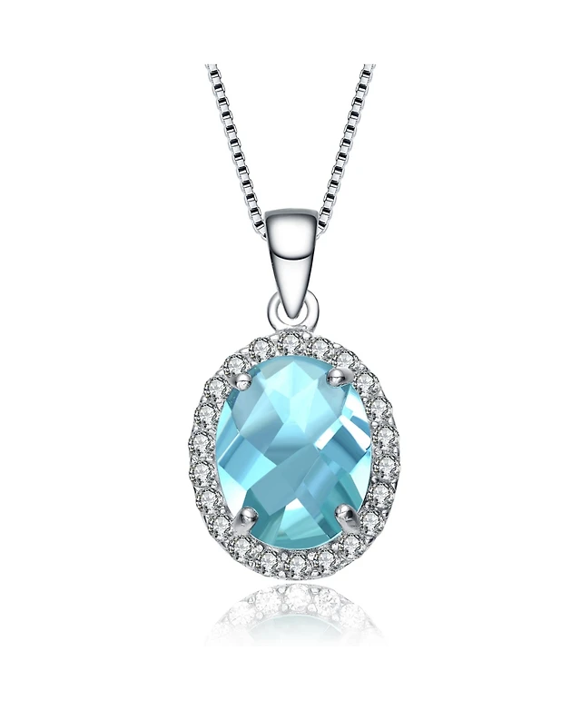 Sterling Silver White Gold Plated Oval Ice Blue Cubic Zirconia Solitaire with Halo Necklace