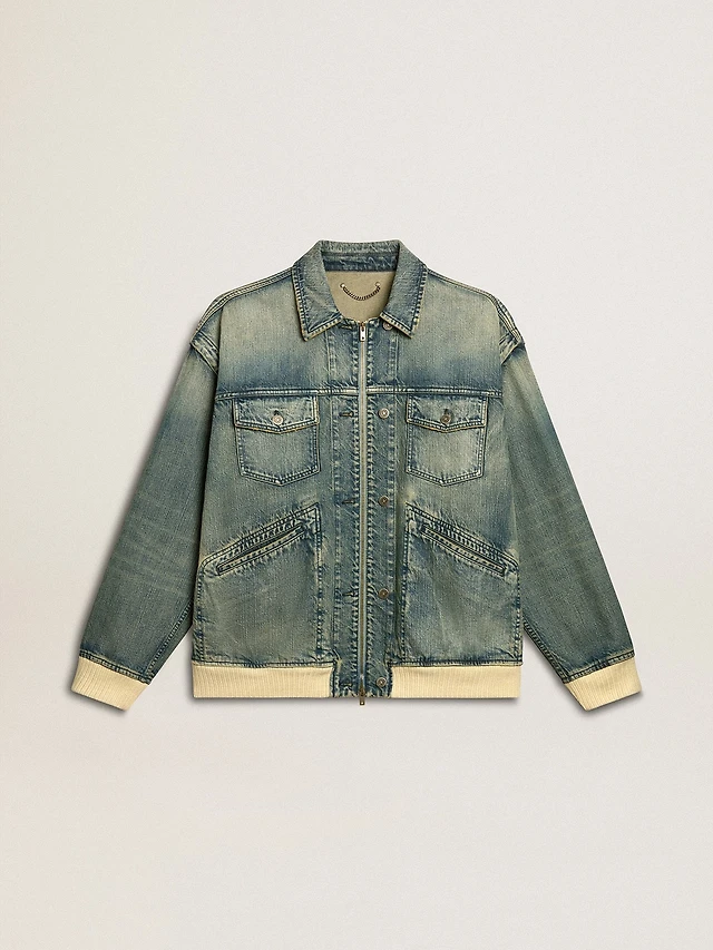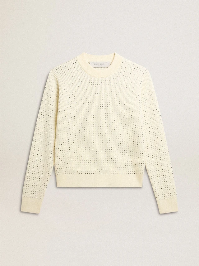 Women's cable-pattern cropped sweater with blue ribbing and crystals
