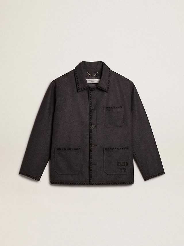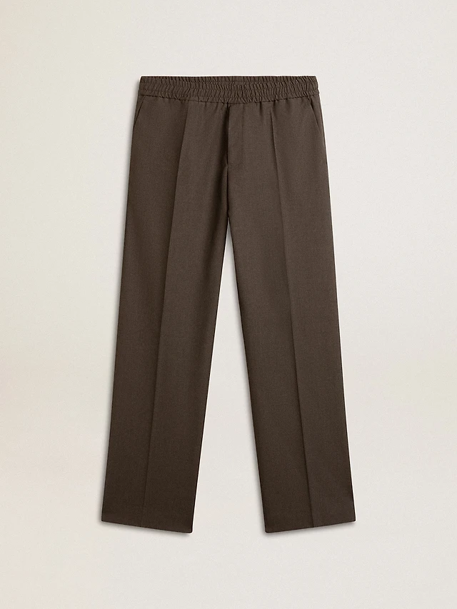 Men's travertine-colored sweater with 'Golden' patch lettering on the back