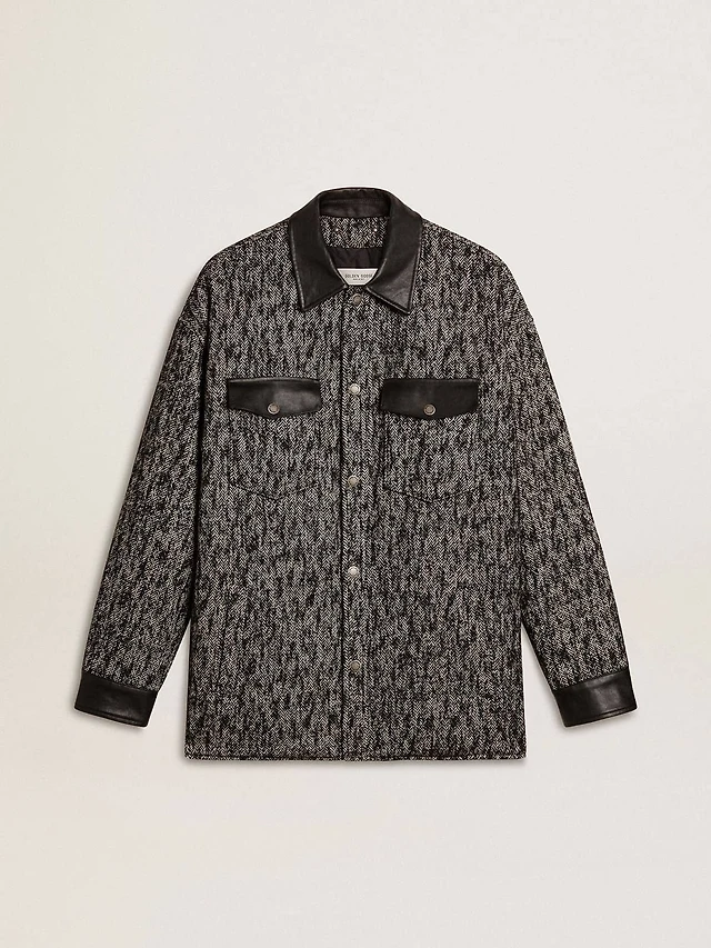 Gray herringbone jacket with black leather details