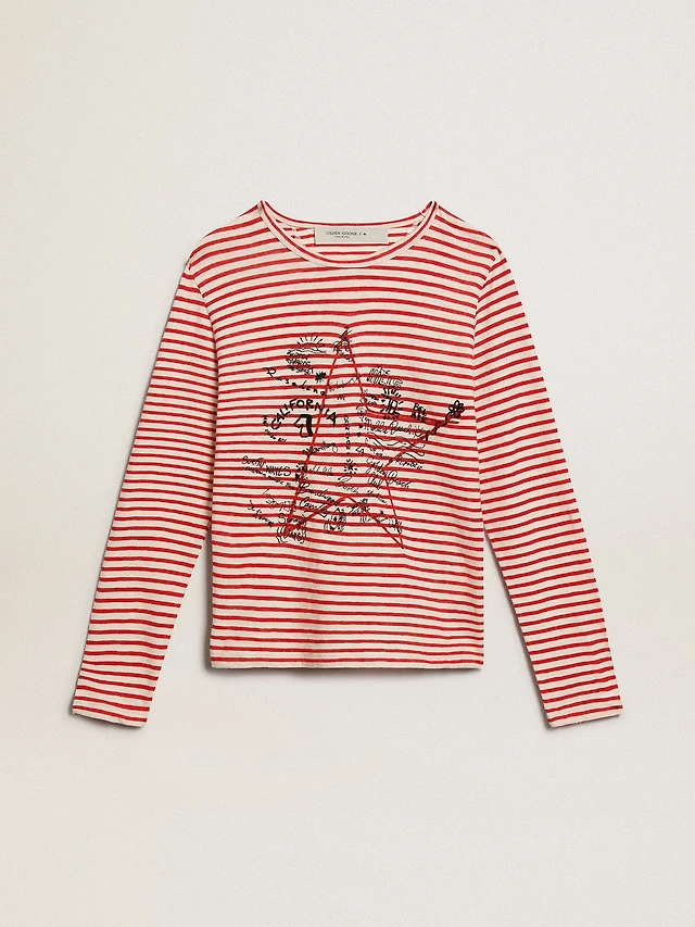 Women's T-shirt with white and red stripes embroidery on the front