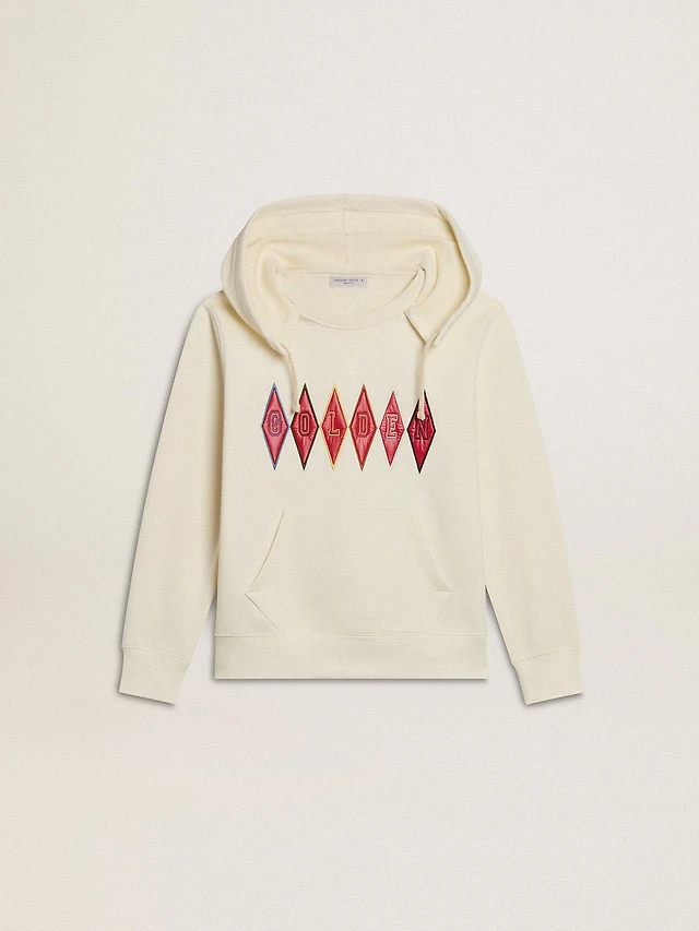 Sweatshirt aged white with multicolor Golden lettering on the front