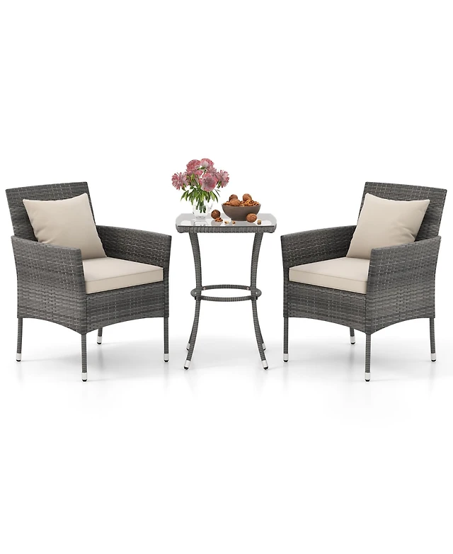 Gymax 3PCS Patio Rattan Sofa Set Outdoor Wicker Conversation Set Glass Tabletop w/ Grey Cushion