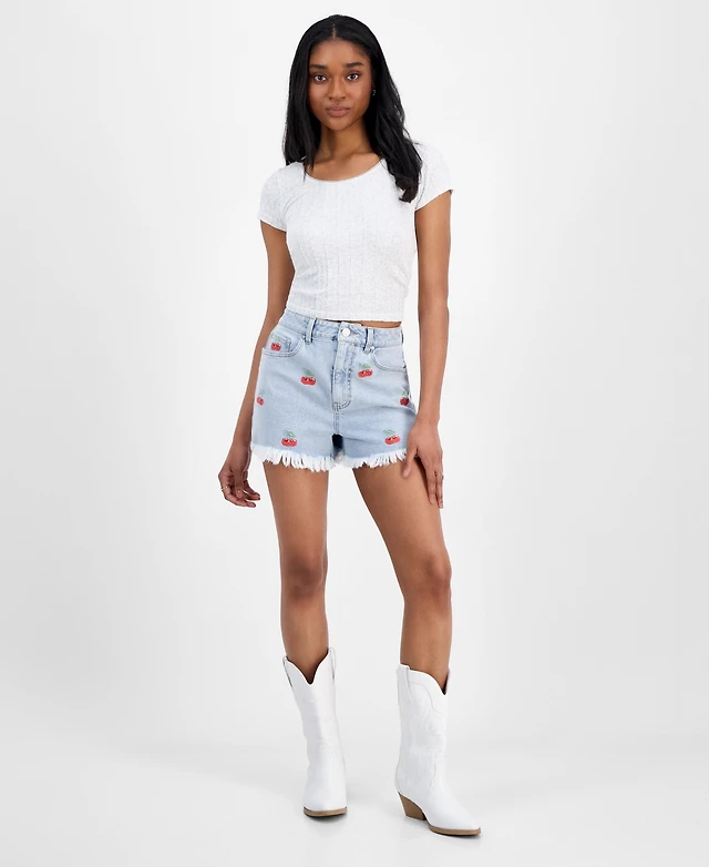 Indigo Rein Juniors' Cherry Embroidered Denim Shorts