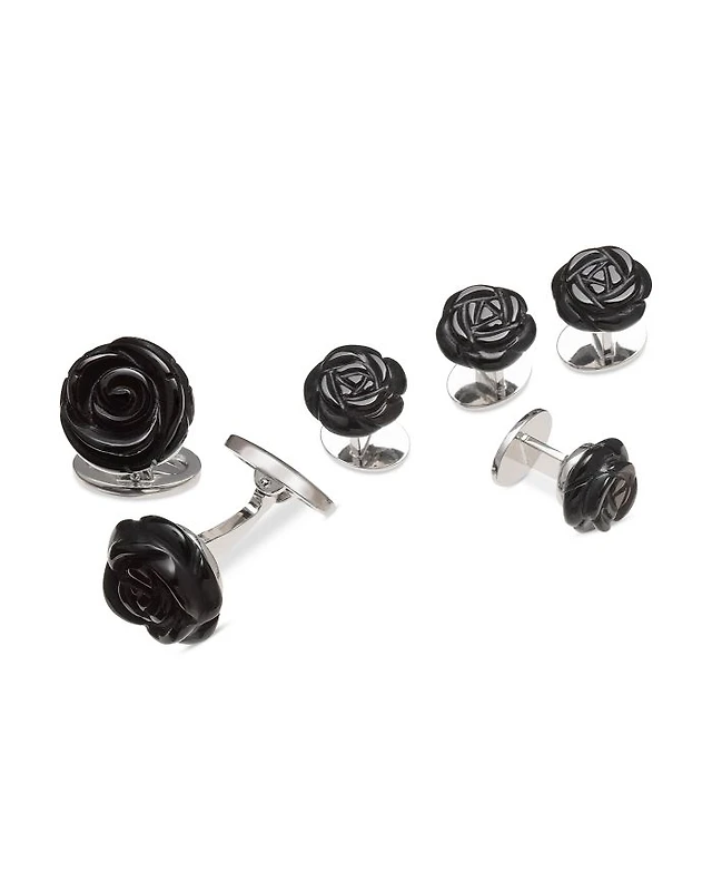 Carved Rose Sterling Silver & Black Onyx Stud & Cufflink Set