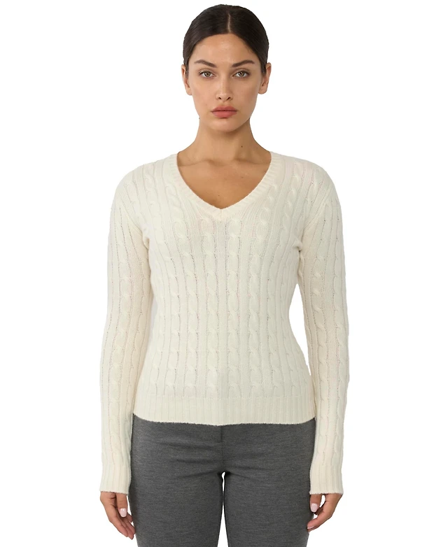 Jennie Liu Women's 100% Cashmere V-Neck Sweater | Chuncky Cable-knit Sweaters