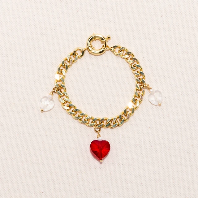 Joey Baby 18K Gold Plated Freshwater Pearls Chunky Chain with Glass Red Heart Charm - Kokoro Bracelet 7" For Women and Girls