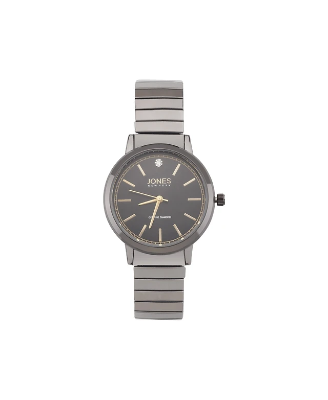 Jones New York Women's Genuine Diamond Black Dial and Silver-Tone Expansion Metal Bracelet Analog Watch 34mm