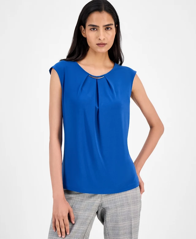 Kasper Pleated-Neck Cap-Sleeve Blouse, Regular & Petite