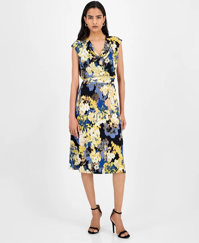 Kasper Women's Printed Cowlneck Tie-Waist Midi Dress