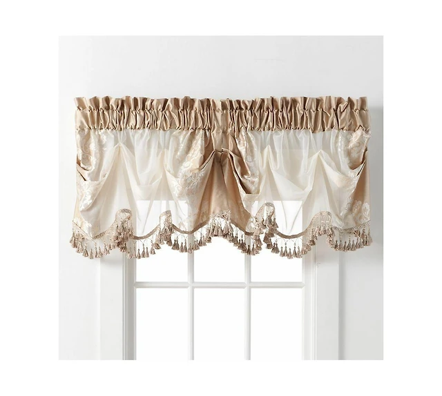 Kate Aurora Jacquard Damask Curtains With An Attached Austrian Valance & Tiebacks - 84 in. Long - Tan