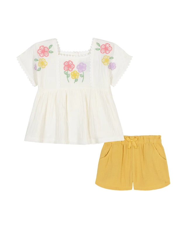 Kids Headquarters Toddler and Little Girls 2-Piece Floral Embroidered Top and Crinkle Knit Shorts Set