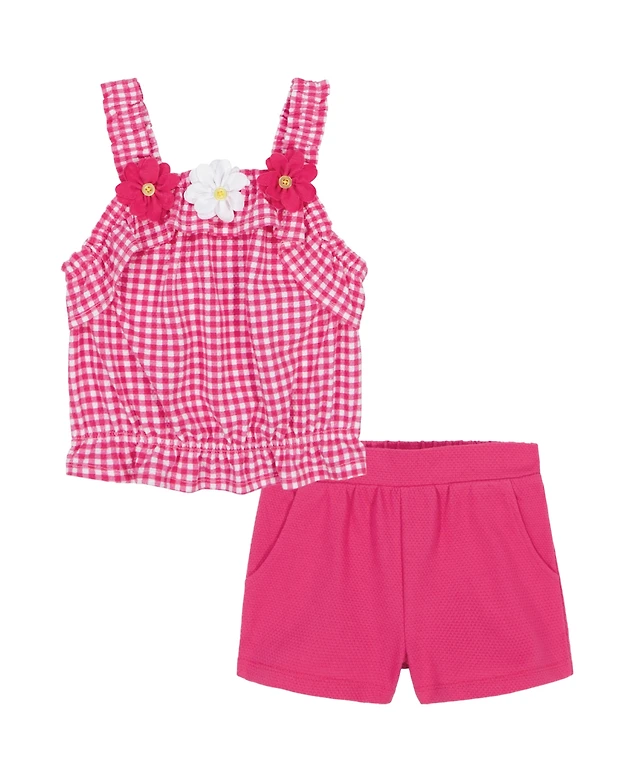 Kids Headquarters Toddler and Little Girls 2-Piece Daisy Gingham Drop Top and Needle Knit Shorts Set