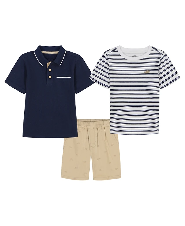 Kids Headquarters Toddler and Little Boys 3-Piece Tipped Polo Shirt, Striped T-Shirt Printed Twill Shorts Set