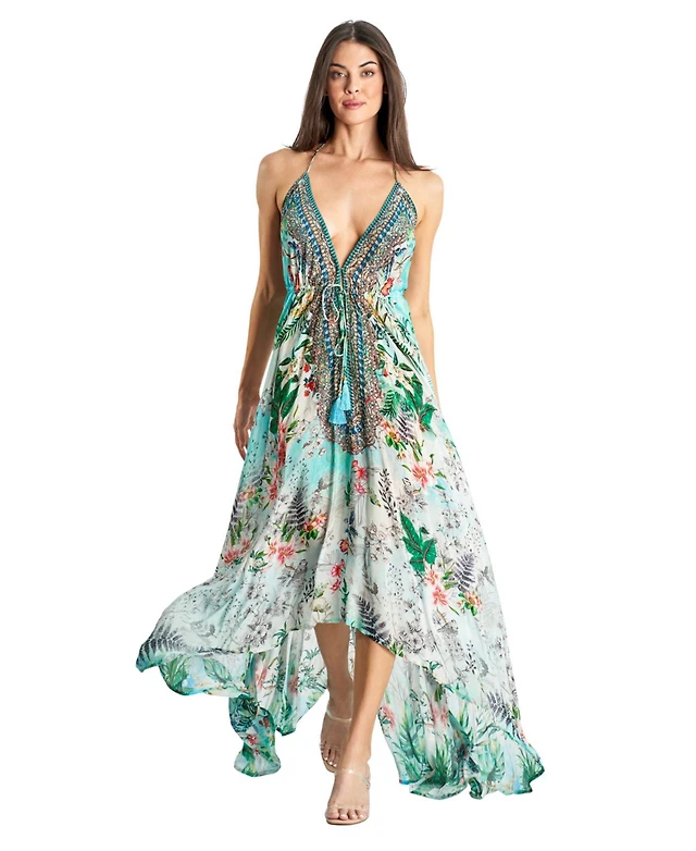 La Moda Clothing Women's Maxi Tropical Print Halterneck Dress