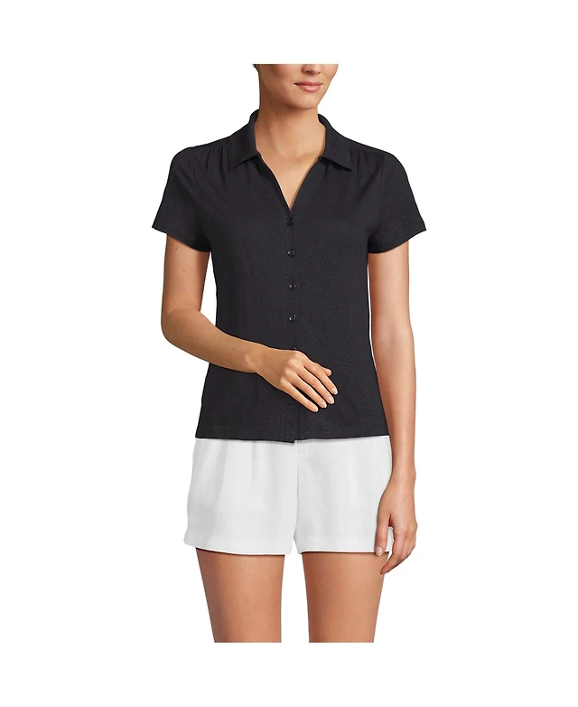 Lands' End Women's Linen Blend Short Sleeve Button Front Polo Top