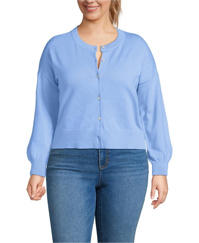 Lands' End Plus Cotton Pointelle Satin Trim Cardigan Sweater