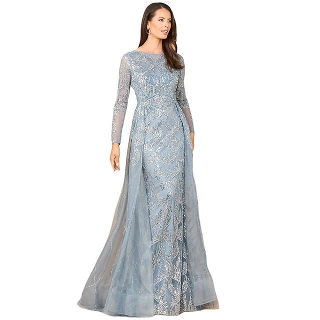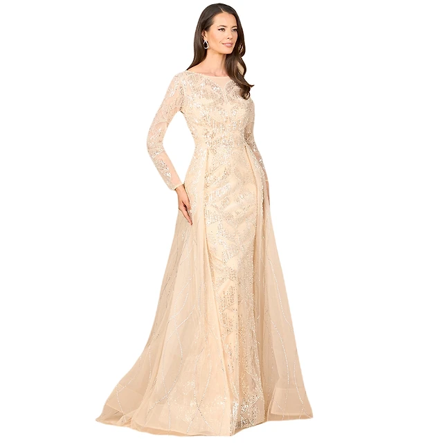 Lara Women's Long Sleeve Gown with Overskirt & Illusion Neckline