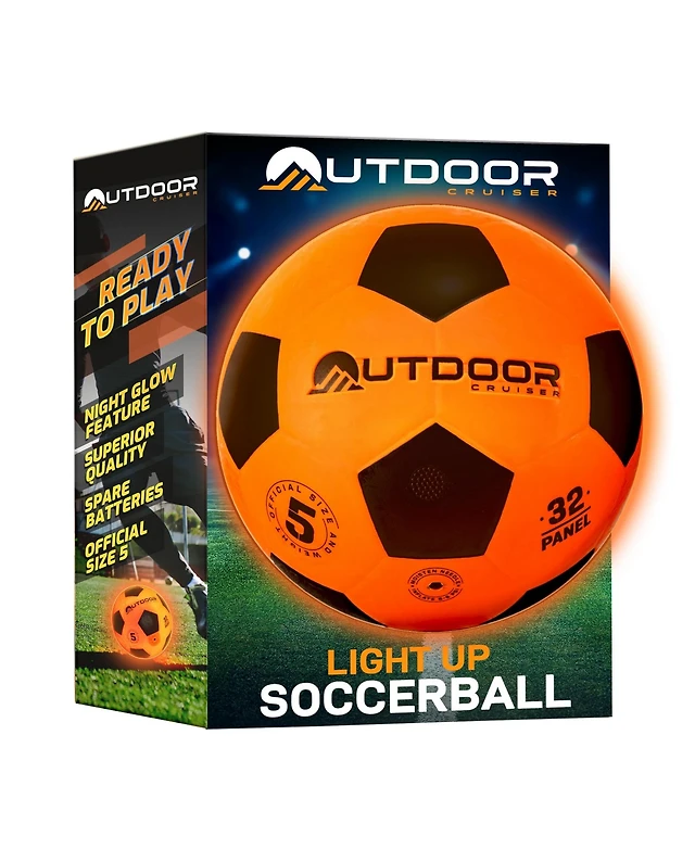 Lifemaster Enjoy glowing soccer fun with the Outdoor Cruiser Light Up Soccer Ball! Waterproof, tap-activated, and glows for up to 30 hours. Includes p