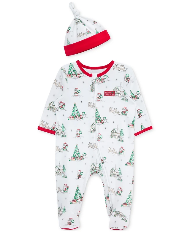 Little Me Baby Cotton Holiday Scene Footed Coverall & Hat