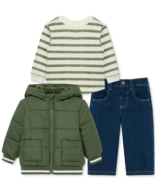 Little Me Baby Boys Hooded Jacket, Striped T-Shirt & Denim Pants, 3 Piece Set