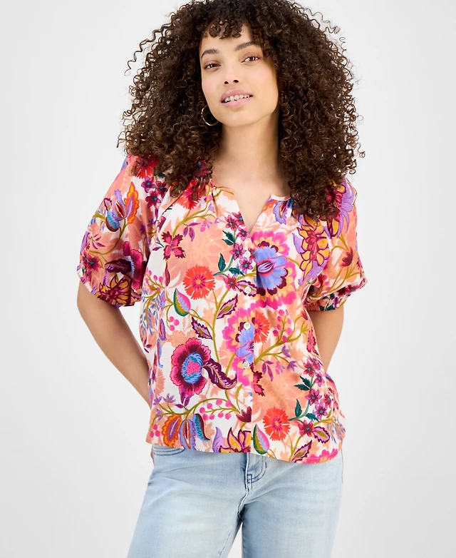 Liverpool Los Angeles Women's Printed Balloon-Sleeve Button-Front Blouse
