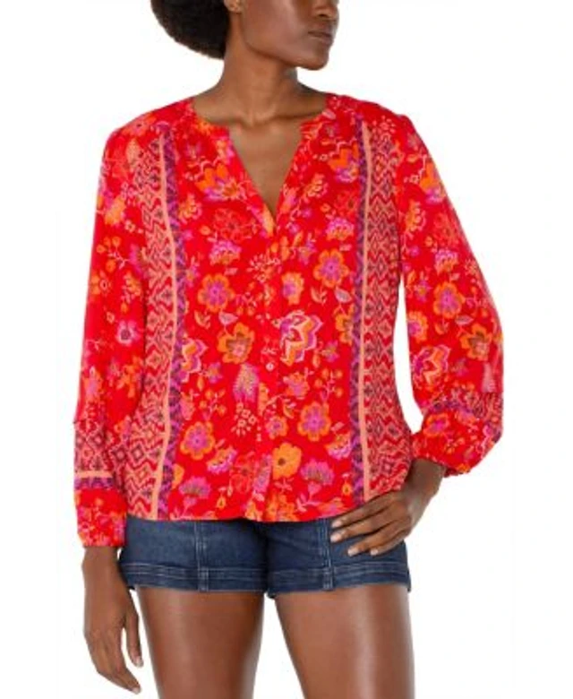 Liverpool Los Angeles Women's Long-Sleeve Popover Shirred Woven Blouse