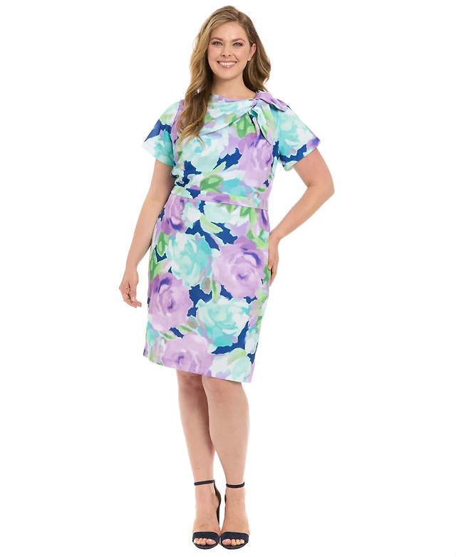 London Times Plus Floral-Print Tie-Neck Sheath Dress