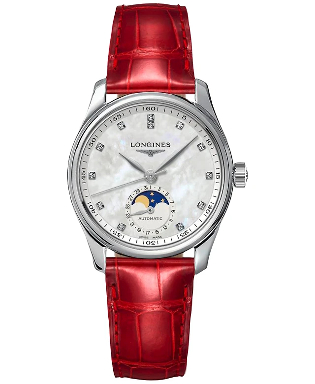 Longines Women's Swiss Automatic Master Diamond (1/20 ct. t.w.) Red Leather Strap Watch 34mm