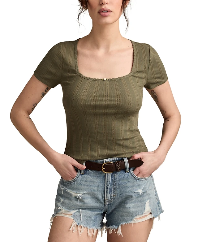 Lucky Brand Women's Cotton Crochet-Trim V-Neck Top
