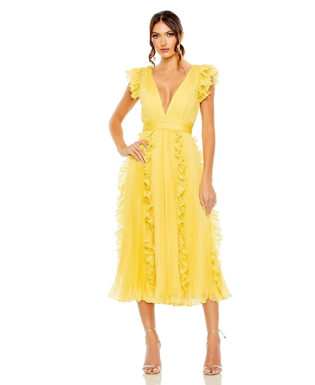Mac Duggal Women's Pleated Chiffon V Neck Ruffle Midi Dress