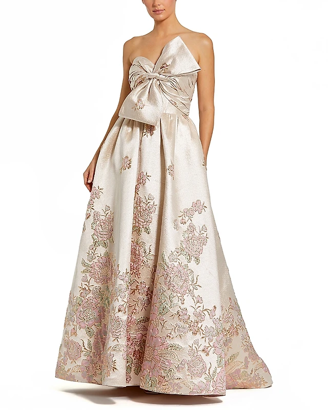 Mac Duggal Brocade Strapless Floral Gown with Bow Detail