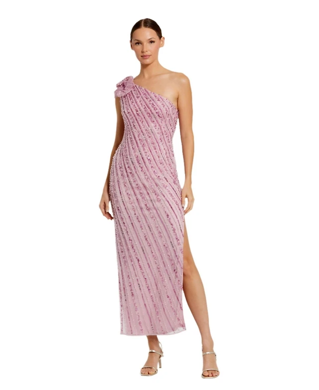 Mac Duggal Women's One Shoulder Beaded Mesh Gown With Flower
