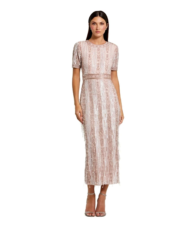 Mac Duggal Women's High Neck Short Sleeve Crystal Fringe Column Dress