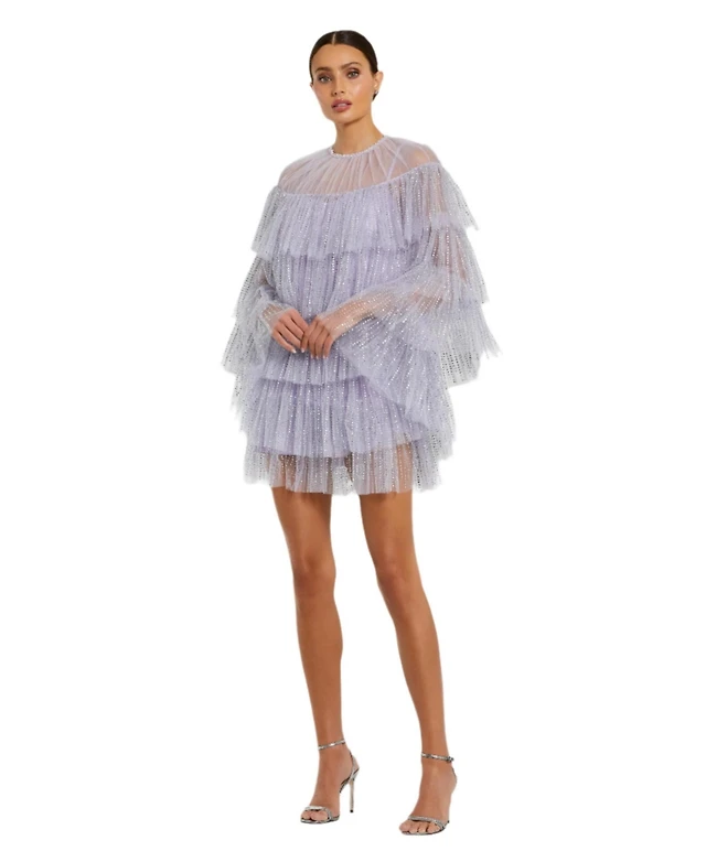 Mac Duggal Women's High Neck Flutter Cap Long Sleeve Tiered Embellished Gown