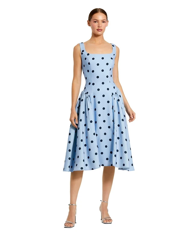 Mac Duggal Women's Polka Dot A-Line Midi Dress with Square Neck and Ruffle Gussets