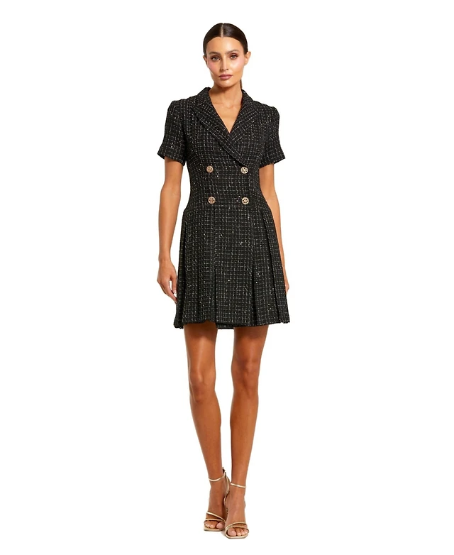 Mac Duggal Women's Short Sleeve V Neck Tweed Blazer Mini Dress