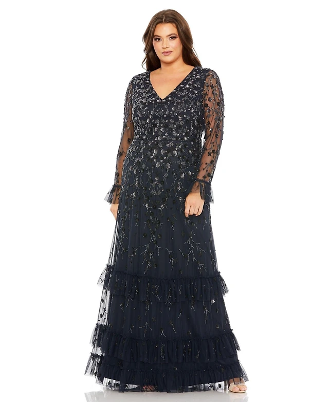 Mac Duggal Women's V-Neck Embellished Long Flutter Sleeve Tired Gown