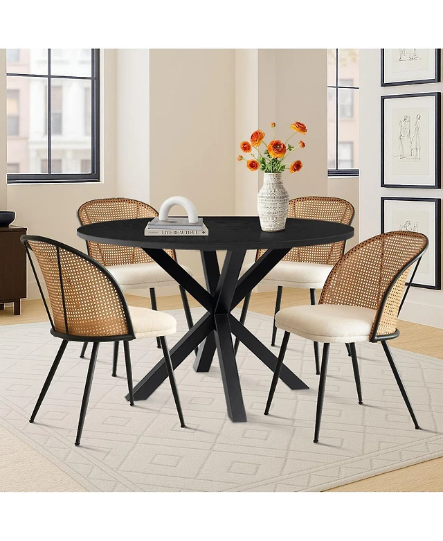 5-Piece 39.4" Round Black Dining Table Set with Starburst Base and 4 Faux Rattan Back Cushioned Chairs, Modern Look for Dining Room-Maison Boucle