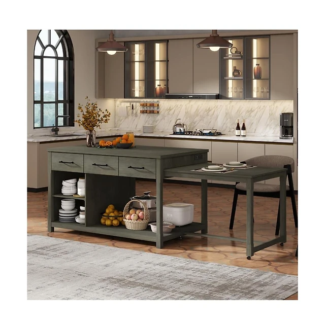 Maison Boucle 48'' Farmhouse-Style White Kitchen Island Cart with Foldable Countertop, Power Strip, 5 Side Racks, and Drawers-Maison