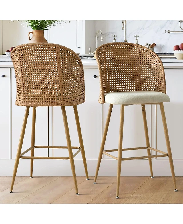 Set of 4 Faux Rattan Back Counter Stools, 27'' Woven Cane Upholstered Chairs for Kitchen Island & Home Bar-Maison Boucle