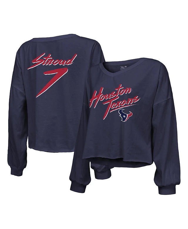 Women's Majestic Threads C.j. Stroud Navy Distressed Houston Texans Name and Number Script Off-Shoulder Cropped Long Sleeve T-shirt