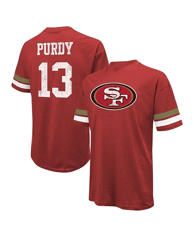 Men's Majestic Threads Brock Purdy Scarlet Distressed San Francisco 49ers Name and Number Oversize Fit T-shirt