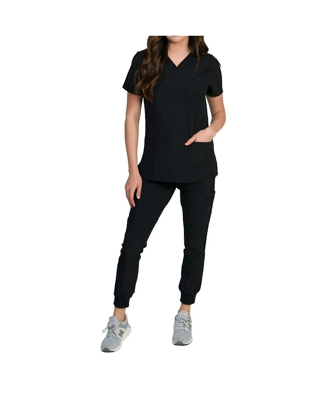 Medgear Women's Fleur Stretch Scrub Set with Zip Chest Pocket Top and Knit Rib Cuffs Jogger Pants