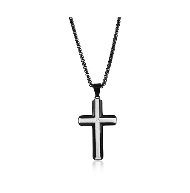 Metallo Stainless Steel Sand Blasted Single Cz Cross Black Plated Necklace