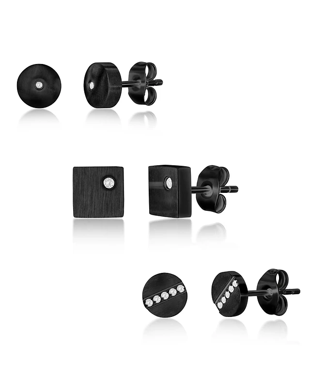 Metallo Black Plated over Stainless Steel, Set of 3 Cz Stud Earrings