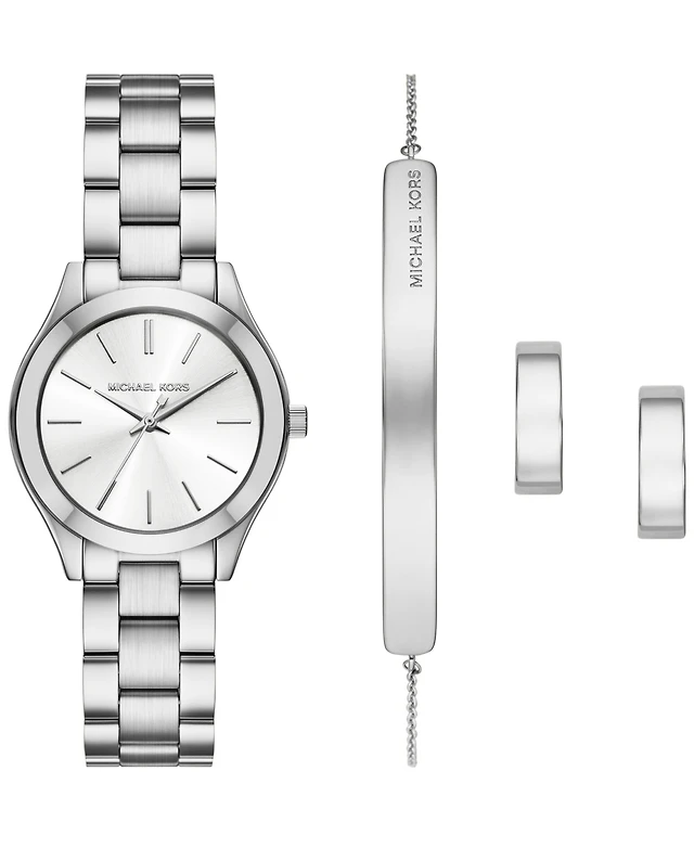 Michael Kors Women's Slim Runway Three-Hand Silver-Tone Stainless Steel Watch and Jewelry Set, 32mm