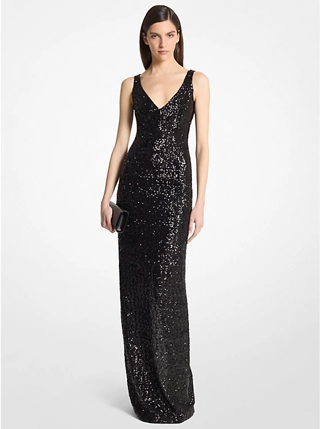 Hand-Embroidered Sequin Stretch Matte Jersey Mock Neck Gown